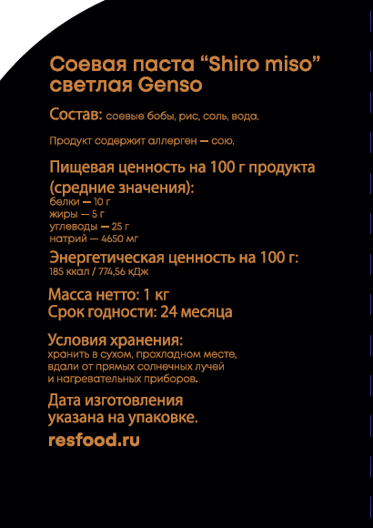 Это ферментированная соевая паста из соевых бобов и риса, в состав которой дополнительно входит только соль и вода. Ферментация проходит исключительно натуральным образом по японскому рецепту в Китае. Процесс исключает все химические добавки. Светлая мисо паста отличается от тёмной менее длительным процессом ферментации, более лёгким и нежным вкусом. Мисо паста является основой для супов, используется для приготовления блюд из мяса, рыбы, морепродуктов и овощей. Также используется для приготовления соусов и блюд с рисом или лапшой с добавлением мяса, рыбы, морепродуктов, тофу и овощей. Антиоксиданты в составе мисо пасты делают её крайне полезным продуктом. Она содержит большое количество витаминов группы В, Е, К и фолиевую кислоту. Продукт содержит высокое количество белков, которые активизируют обмен веществ, регулируют клеточную защиту и воспроизводство новых клеток. Употребление источника пробиотиков налаживает пищеварение, улучшает переработку клетчатки и другой поступающей пищи.