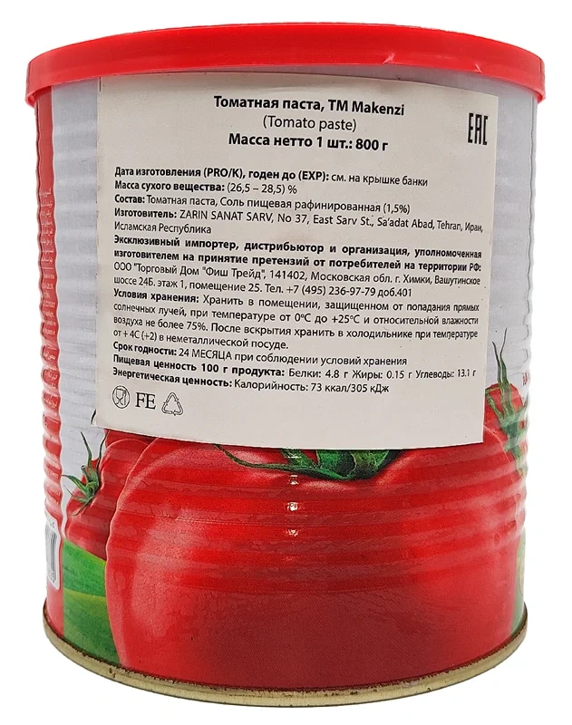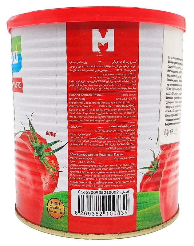 В основе любой иранской томатной пасты лежит сырье, прошедшее строгий входной контроль, без добавления овощного и фруктового пюре, а также полное отсутствие красителей и ароматизаторов. Продукт имеет насыщенный вкус, запах и цвет, которые характерны для натурального томатного сырья без каких-либо вторичных обработок. Никаких добавок и химического синтеза при взращивании урожая не применяется.