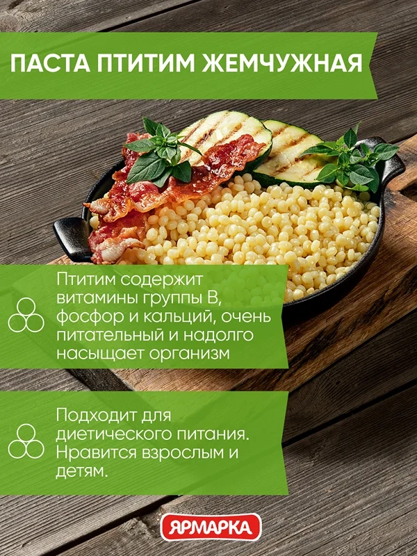 Птитим легко и просто приготовить, он подходит в качестве гарнира, а также может быть добавлен в супы или салаты. Благодаря своим свойствам, он украсит любые горячие или холодные блюда и придаст им особый оригинальный вкус.