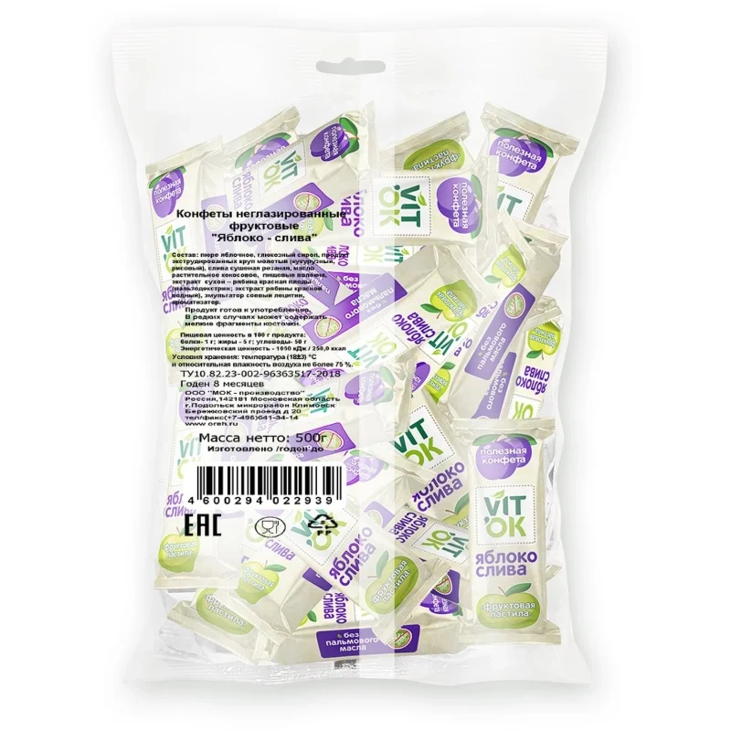 Фруктовая конфета Яблоко-Слива без сахара, изготовлена из яблочного пюре с кусочками спелой сливы и яблока. Это полезный питательный десерт с ярким ягодным вкусом. 100% натуральный продукт, без пальмового масла. Фруктовая конфета VITok утолит голод и потребность в сладком без вреда для здоровья и фигуры, придется по вкусу тем, кто соблюдает диету, занимается спортом, ведет здоровый образ жизни. Масса нетто: 500 г. Состав: пюре яблочное, глюкозный сироп, продукт экструдированных круп молотый (кукурузный, рисовый), слива сушеная резаная, масло растительное кокосовое, пищевые волокна, экстракт сухой - рябина красная плоды (мальтодекстрин; экстракт рябины красной водный), эмульгатор соевый лецитин, ароматизатор натуральный "Яблоко". Пищевая ценность: белки- 1,5 г; жиры- 5 г; углеводы - 50 г. Энергетическая ценность: 1060 кДж/250 ккал. Срок годности: 240 суток. Условия хранения: хранить при температуре 18 С и относительной влажности воздуха не более 75%. Не подвергать воздействию прямого солнечного света. Страна производства: Россия.