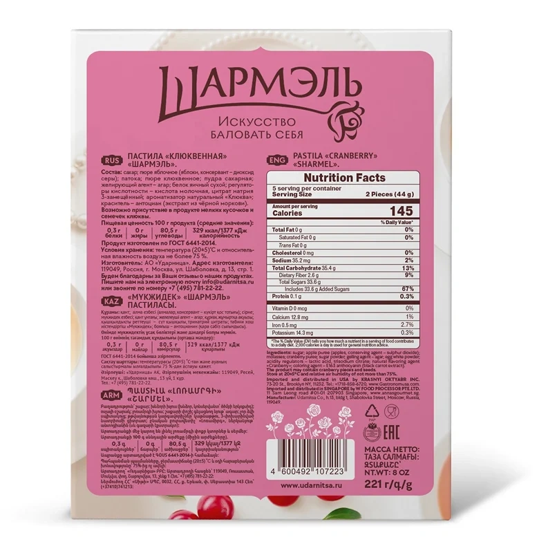 Легкая, воздушная пастила, приготовленная на основе яблочного и клюквенного пюре с добавлением патоки и агара. Отличается нежной консистенцией и приятным кисло-сладким вкусом. Изготовленное из натурального фруктового пюре, это сладкое лакомство практически не содержит жира и не причинит вреда фигуре. Эта старинная сладость известна на Руси еще с XIV века. Тогда ее делали из традиционных русских сортов яблок (например, из 'Антоновки'). Пюре взбивали до пышной консистенции и запекали в русской печи.