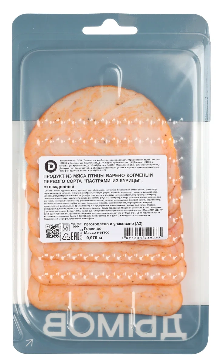 Пастрами из курицы Дымов варено-копченая нарезка, 70г