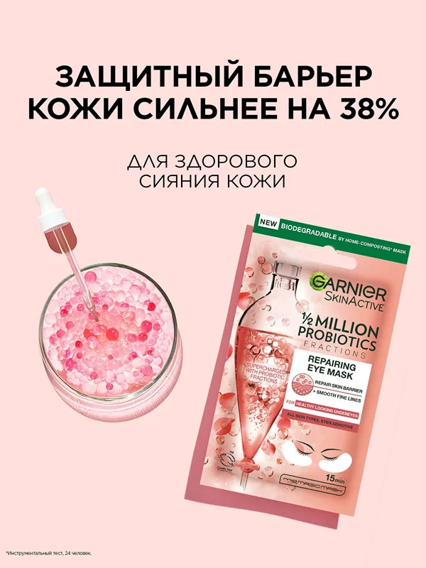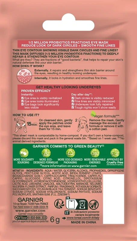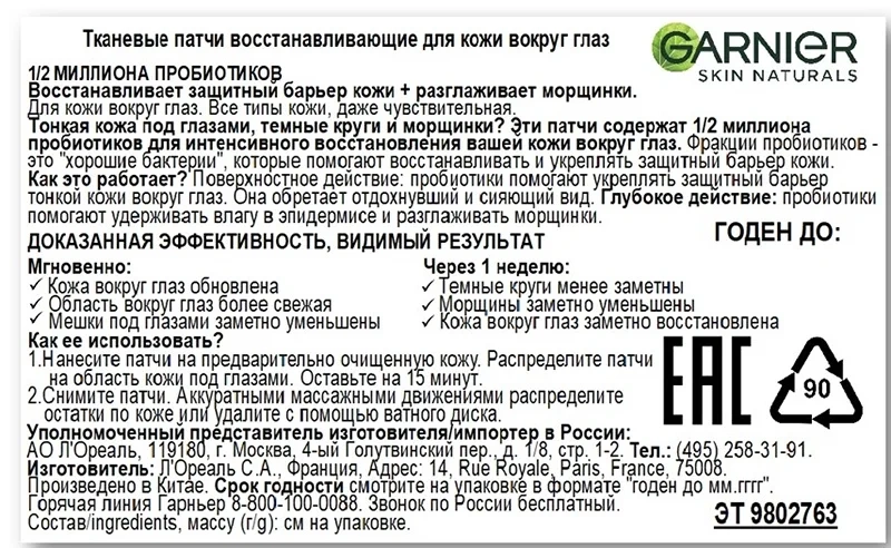 Свежая, отдохнувшая, сияющая – именно такой будет ваша кожа после применения тканевых патчей с пробиотиками! Формула, разработанная Garnier для восстановления и увлажнения столь деликатной области, помогает укрепить кожный барьер, повысив устойчивость кожи к воздействию извне. Активные ингредиенты в составе формулы придают зоне вокруг глаз сияющий и отдохнувший вид, насыщают влагой и укрепляют собственную защитную функцию кожи. Высокая концентрация пробиотиков укрепляет кожу и уменьшает покраснения, глицерин смягчает, а черный чай тонизирует и снимает отечность. После применения патчей кожа мгновенно приобретает ощущение свежести, выглядит обновленной и сияющей. При регулярном использовании становится заметен восстанавливающий и увлажняющий эффект ухода, морщинки заполняются, темные круги с каждым днем уменьшаются.