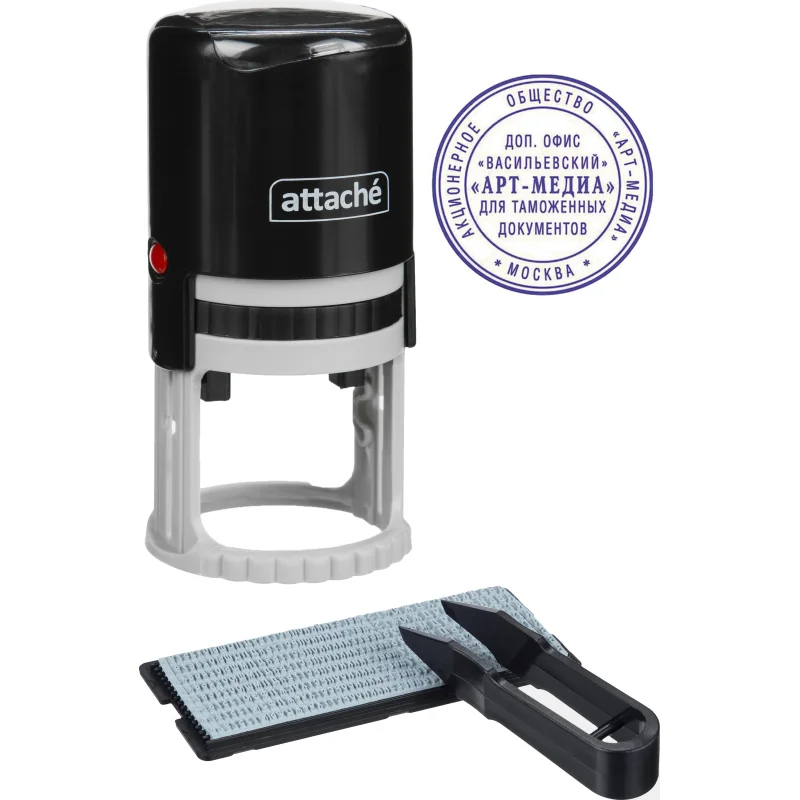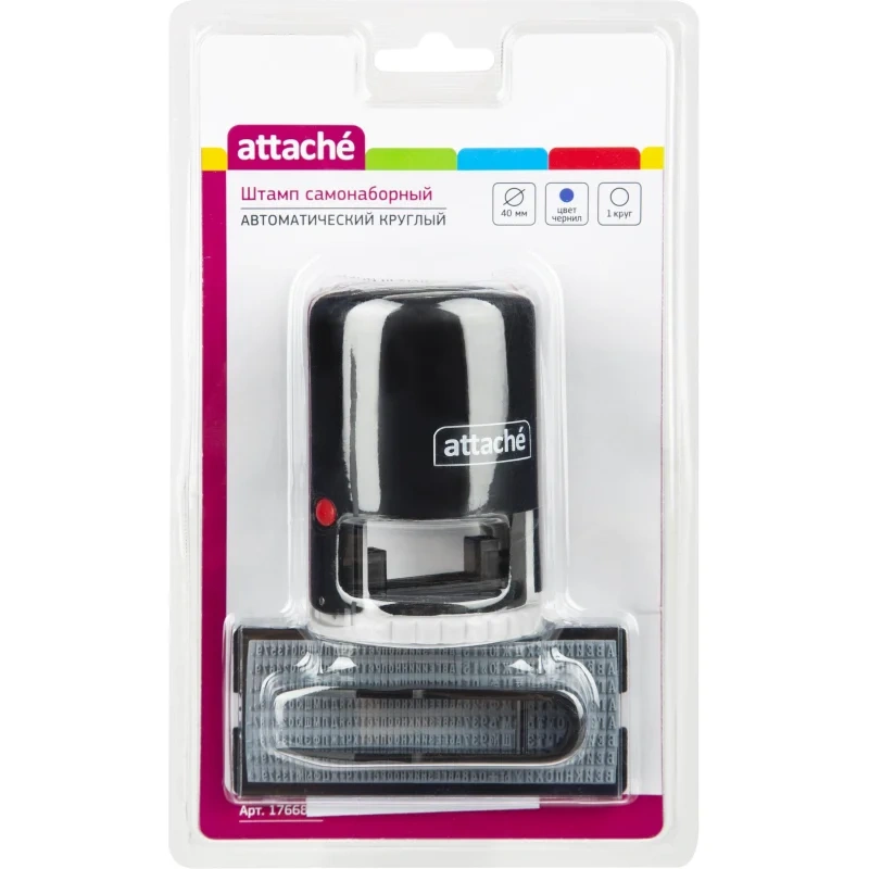 Печать самонаборная круглая Attache 1 круг R40 8010 Печать самонаборная круглая Attache предназначена для самостоятельного создания и изменения текста оттиска. Легкая и чистая замена штемпельной подушки. Диаметр круга: 40 мм. Количество кругов: 1.