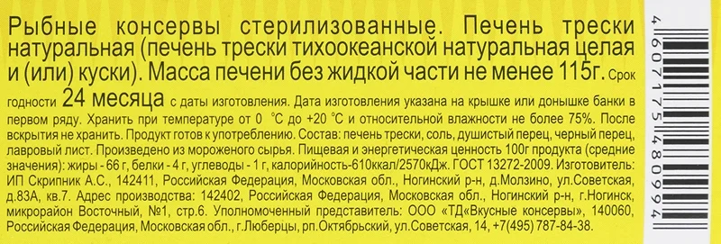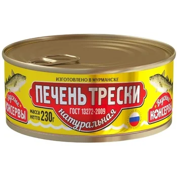 Печень трески Вкусные консервы, 230г – это натуральный продукт, который не содержит ГМО, красителей и других синтетических добавок. Печень трески является деликатесным продуктом и несет в себе комплекс веществ, незаменимых для человеческого организма. Она обогащена витаминами D, A и B2, а также Омега-3 ненасыщенные жирные кислоты, которые повышают продолжительность жизни.