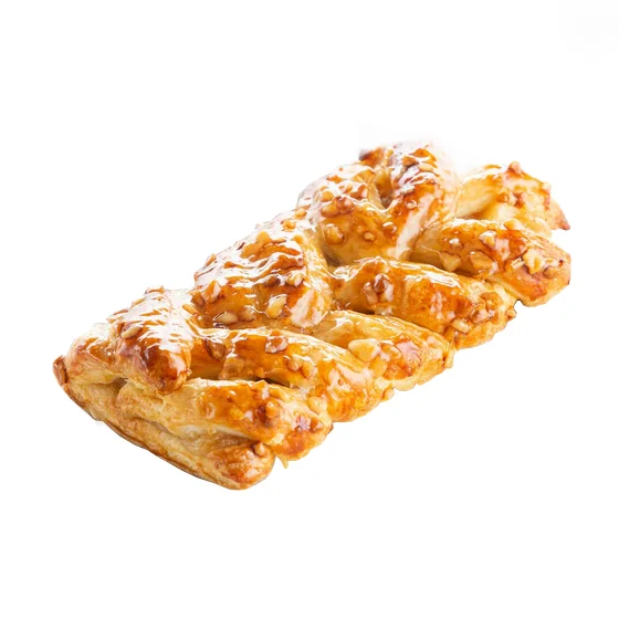 Поджаристая блестящая хрустящая слоёная булочка плетеной формы с начинкой 'Кленовый сироп ' с добавлением спелого яблока , посыпанная арахисом.