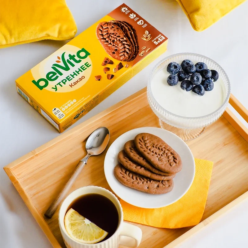Bитаминизированное печенье belVita «Утреннее» с какао — богато злаками и обогащено витаминно-минеральным комплексом. идеально для утра: дополняет йогурт, творог, каши, фрукты и делает завтрак ещёвкуснее и питательнее. Печенье утреннее — прекрасная альтернатива круассанам, пряникам, крекерам, кексам, сушкам и другой выпечке; отлично подходит к чаю и к кофе, вкусно с молоком, кефиром, ряженкой, соком, какао и другими напитками. Не содержит продуктов животного происхождения, поэтому подходит в пост. Печенье в индивидуальной упаковке удобно взять с собой на работу или на прогулку, в поездку, на пикник или на дачу. Печенье belVita в составе сбалансированного перекуса — это то, что позволит зарядить бодростью и оптимизмом каждый день. А ведь именно хорошее настроение — это залог успешного дня!