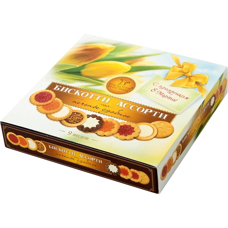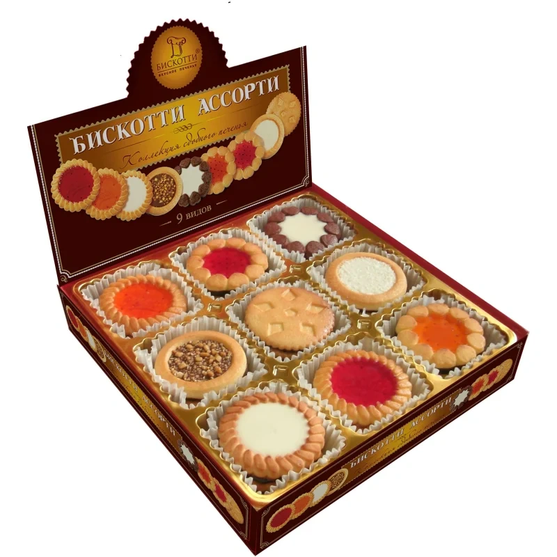 Ассорти включает 9 видов печенья, отражающих потребности многих сладкоежек и ценителей изысканных лакомств:
