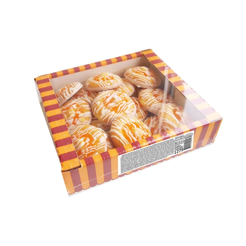 Состав: мука пшеничная хлебопекарная в/с, крем пастеризованный Beticrem со вкусом апельсина (вода подготовленная, сахар, декстроза, сироп глюкозно-фруктозный, загуститель Е1442, агент влагоудерживающий глицерин, пюре яблочное, комплексная пищевая добавка (эмульгатор E460, загустители: Е466, Е410, Е412), регулятор кислотности лимонная кислота, ароматизатор «Апельсин», консервант сорбат калия, соль, красители (Е150d, Е110, Е102)), глазурь белая (сахар, заменитель какао-масла нетемперируемый лауринового типа (гидрогенизированный пальмоядровый стеарин, эмульгаторы (Е492, лецитин соевый)), сыворотка молочная сухая, эмульгаторы (лецитин соевый, Е476), ароматизаторы («Молоко», «Ванилин»), краситель диоксид титана), сахар, масло подсолнечное, вода питьевая, агент влагоудерживающий глицерин, яйцо куриное пищевое, инвертный сироп (сахар, вода питьевая, регулятор кислотности лимонная кислота), крахмал кукурузный, разрыхлители (Е450i, Е500ii), молоко сухое, консервант сорбиновая кислота, загуститель Е415, регулятор кислотности лимонная кислота, краситель каротины.