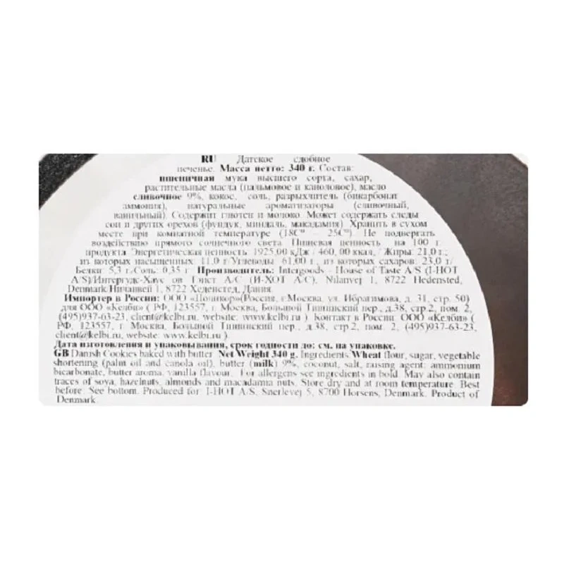 Состав: пшеничная мука высшего сорта, сахар, растительные масла (пальмовое и каноловое), масло сливочное 9%, кокос, соль, разрыхлитель (бикарбонат аммония), натуральные ароматизаторы (сливочный, ванильный). Продукт может содержать следы сои, фундука, миндаля и ореха макадамии.