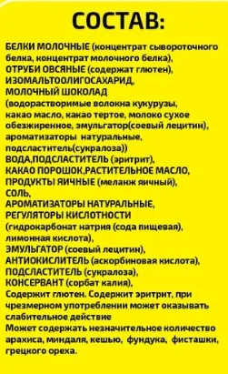 Белки молочные (концентрат сывороточного белка, концентрат молочного белка), отруби овсяные (содержат глютен), изомальтоолигосахарид, шоколад (сахар, какао-масса, какао-масло, эмульгатор (соевый лецитин)), вода, эритрит, какао-порошок, растительное масло, продукты яичные (меланж яичный), соль, натуральные ароматизаторы, гидрокарбонат натрия (сода пищевая), регулятор кислотности - лимонная кислота, эмульгатор (соевый лецитин), антиокислитель (аскорбиновая кислота), подсластитель - сукралоза, консервант (сорбат калия).