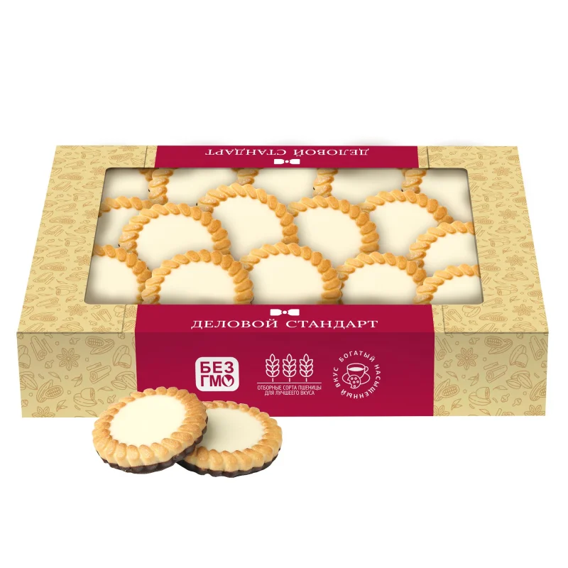 Печенье «Деловой Стандарт» — великолепное рассыпчатое печенье, которое гармонично сочетается с нежной кремовой начинкой и шоколадной глазурью.