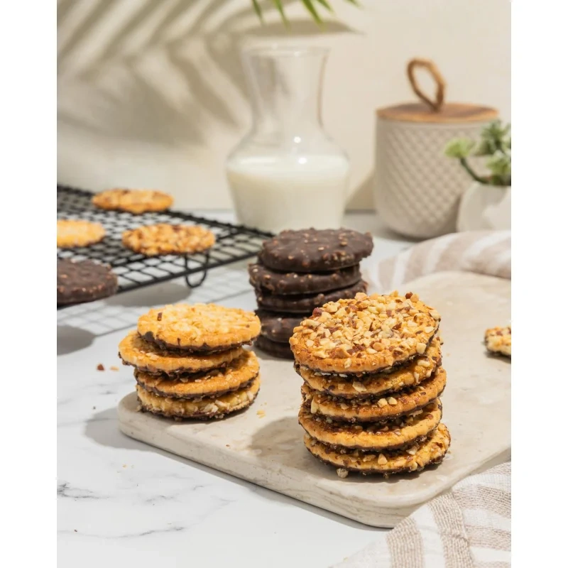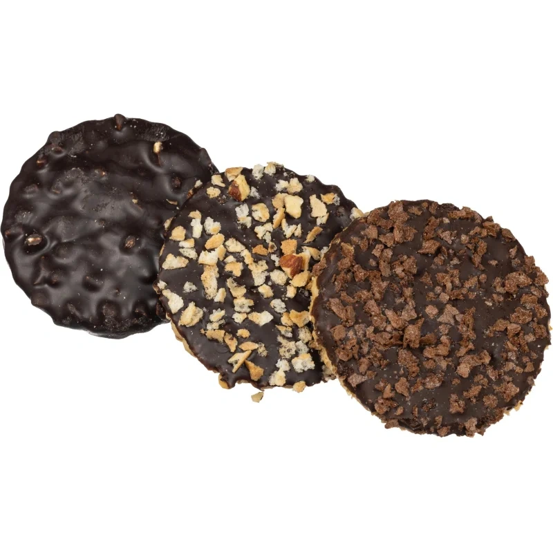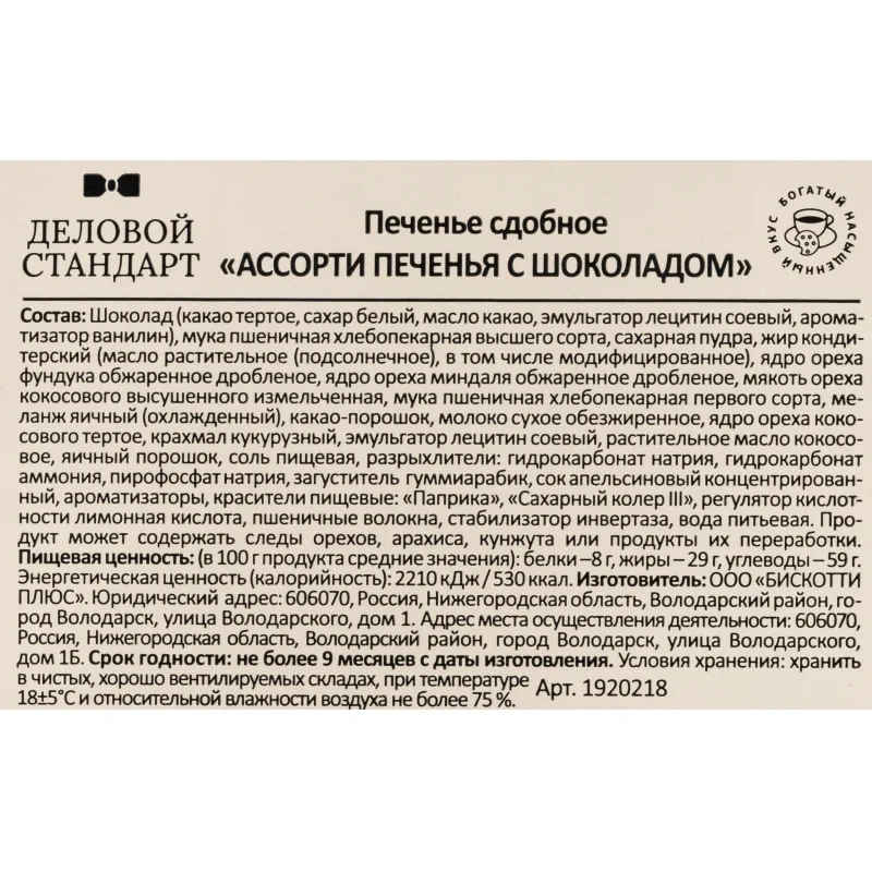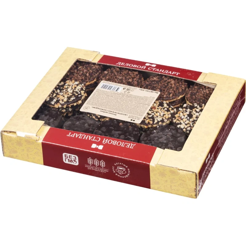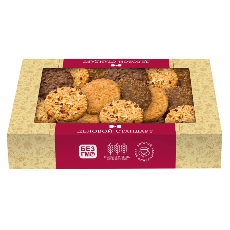 Сдобное печенье «Деловой Стандарт» — ассорти из трёх видов нежного хрустящего печенья, декорированного дроблёными фундуком, миндалём и кокосовой стружкой. Донышко печенья покрывается натуральным шоколадом с бисквитной крошкой.