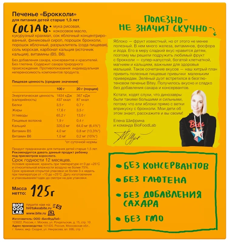Детское печенье Biteу с брокколи - вкусный и полезный перекус. Еще никогда не было так просто уговорить ребенка есть овощи. Печенье с брокколи имеют натуральный овощной вкус, а яблоко и финики придают натуральную сладость. При этом в составе нет добавленного сахара, дрожжей, белой муки, молока, сои и яиц. Мы уверены, что оно в разы полезнее и вкуснее обычных сладостей. Печенье обогащено кальцием и витаминами, необходимыми для гармоничного развития ребенка. Оно упаковано в интерактивную коробочку с красочными иллюстрациями мира динозавров, а внутри целая коллекция фигурного печенья в виде тропических листьев и динозавров. Главная особенность всех упаковок печенья Bitey - они легко превращаются в игрушки.