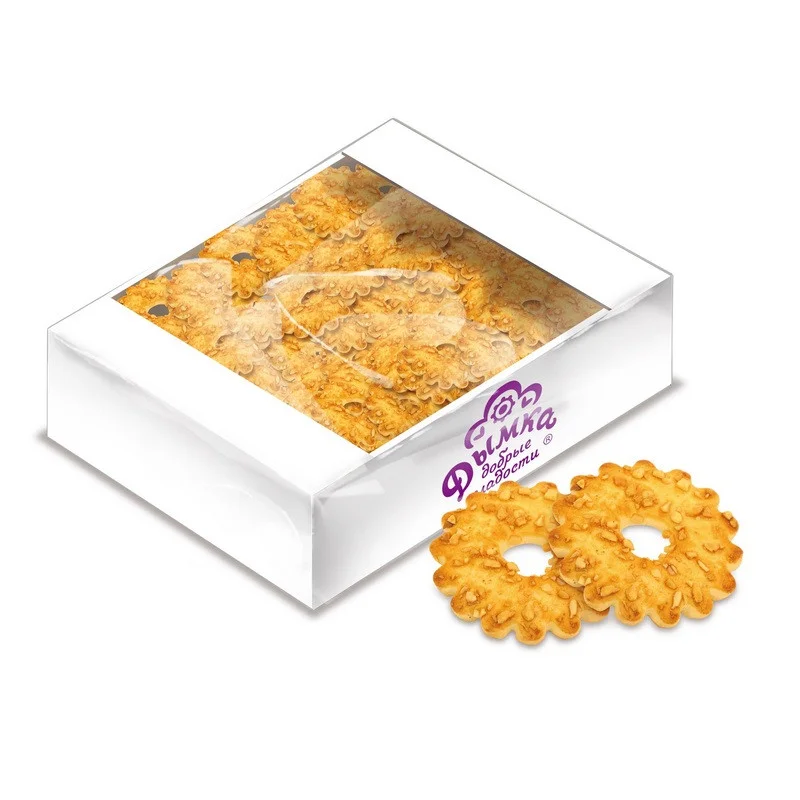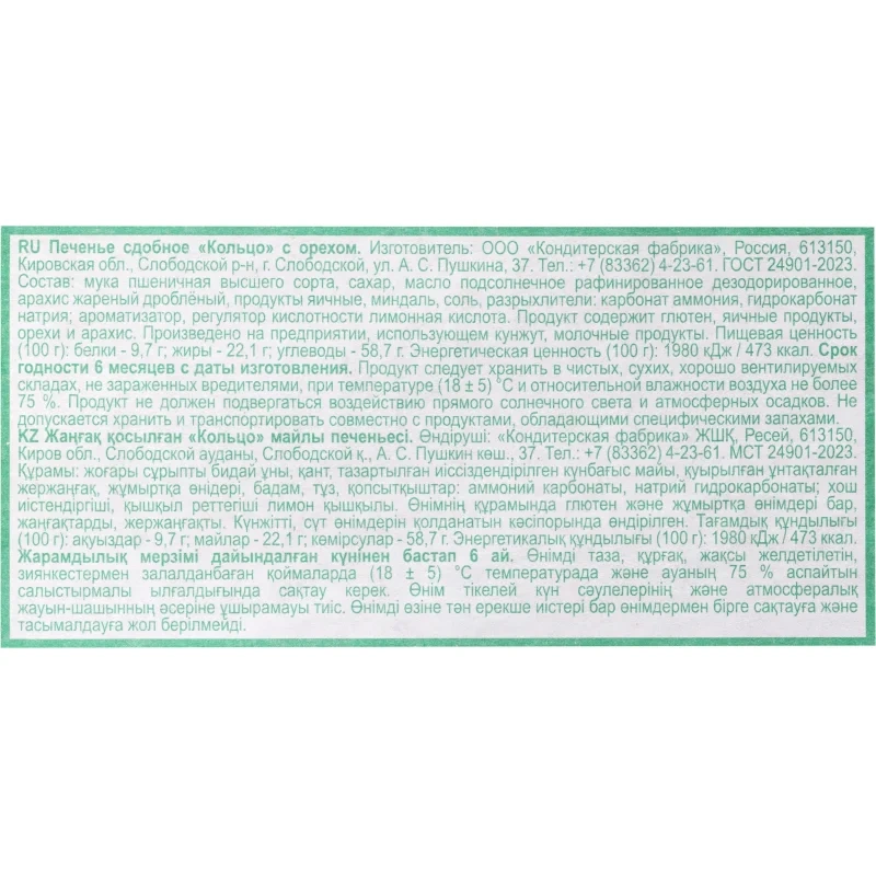 Это рассыпчатое песочное печенье в виде фигурного кольца с посыпкой дроблёным арахисом. Имеет узнаваемый с детства вкус. Станет отличным дополнением к семейному чаепитию или сладким угощением для гостей.