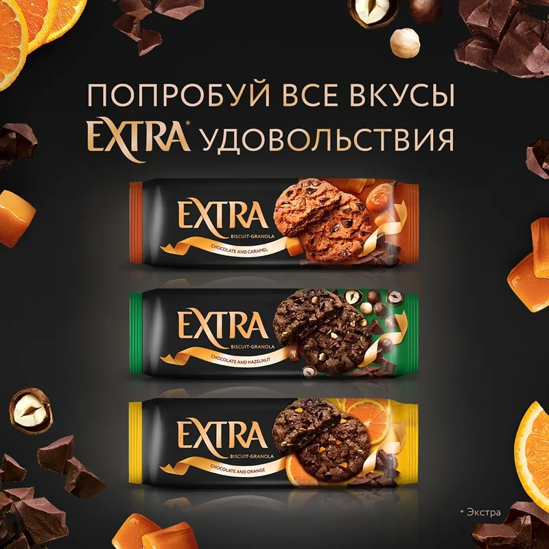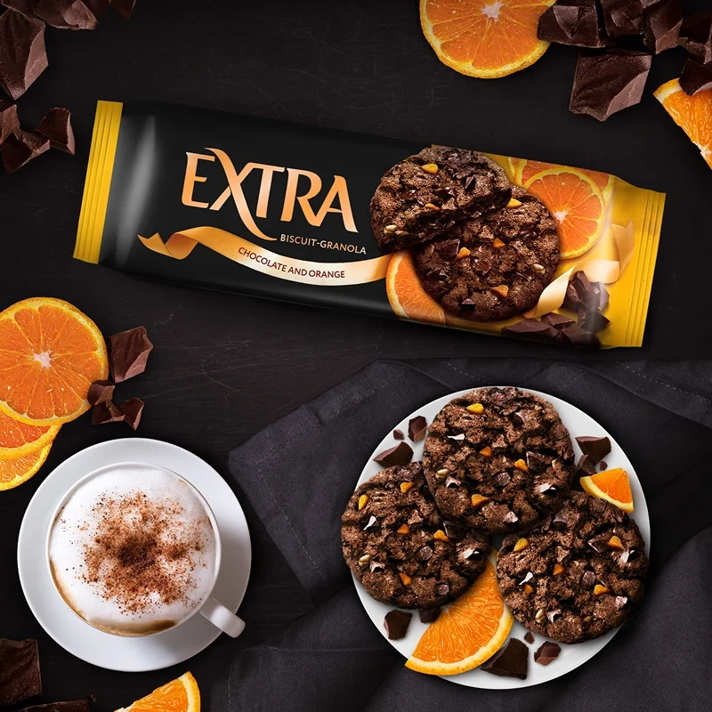 Печенье сдобное ExtraSi Гранола с шоколадом и апельсином — это уникальный продукт, который сделан с добавлением запечённых злаков и сохраняет воздушно-хрустящую текстуру гранолы.
