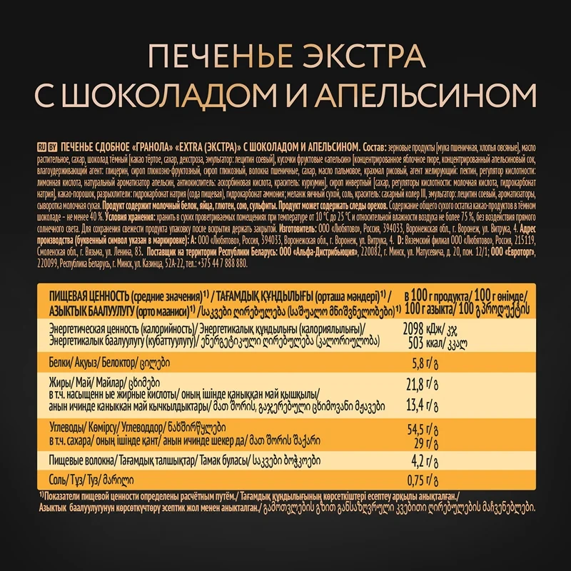 Состав: зерновые продукты [мука пшеничная, хлопья овсяные], сахар, масло растительное, тёмный шоколад [какао тёртое, сахар, декстроза, эмульгатор: лецитин соевый], кусочки фруктовые «апельсин» [концентрированное яблочное пюре, концентрированный апельсиновый сок, влагоудерживающий агент: глицерин, глюкозно-фруктозный сироп, глюкозный сироп, пшеничные волокна, сахар, пальмовое масло, крахмал рисовый, агент желирующий: пектин, регулятор кислотности: лимонная кислота, натуральный ароматизатор апельсин, антиокислитель: аскорбиновая кислота, краситель: куркумин), сироп инвертный [сахар, регуляторы кислотности: молочная кислота, гидрокарбонат натрия], какао-порошок, меланж яичный сухой, разрыхлители: гидрокарбонат аммония, гидрокарбонат натрия (сода пищевая); соль, краситель: сахарный колер III, эмульгатор: лецитин соевый, ароматизаторы. Продукт содержит яйца, глютен, сою, сульфиты. Содержание общего сухого остатка какао в тёмном шоколаде составляет 49%. Продукт может содержать следы молочного белка, орехов.