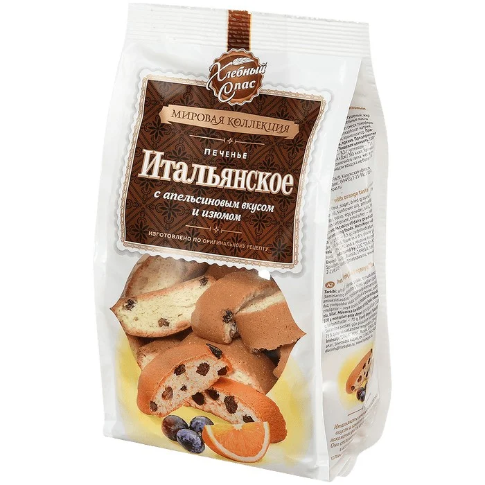 Хлебный спас печенье итальянское с апельсином и изюмом - натуральное печенье с кусочками апельсина и изюма, создает теплое настроение и отлично дополняет семейные и дружеские чаепития.