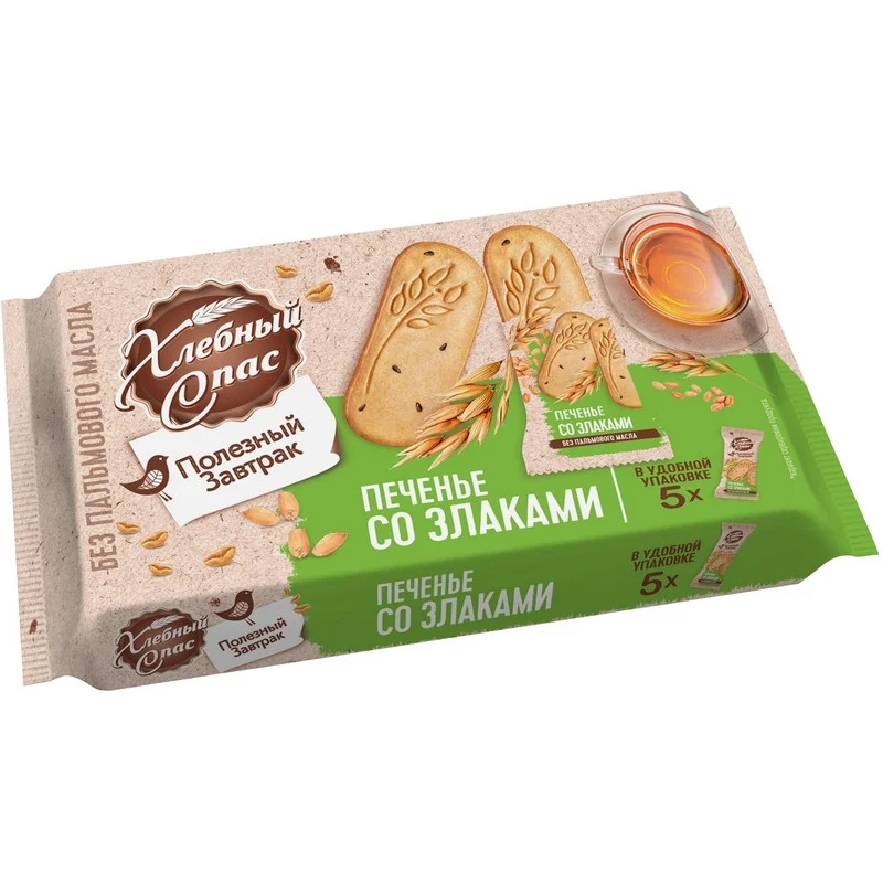 Печенье сдобное Хлебный Спас «Полезный завтрак» со злаками 160 г — необычное для отечественного рынка печенье в формате мобильного снека. Основное достоинство — удобная индивидуальная упаковка, благодаря чему расширяются привычные границы употребления. Традиционный продукт — печенье превращен в современный актуальный формат продукта — «полезный и мобильный снек». Печенье «Полезный завтрак» легко взять с собой в дорогу, угостить коллег на работе, дать ребенку в школу. В составе печенья — натуральные полезные ингредиенты, без добавления пальмового масла, а благодаря отличным вкусовым свойствам печенье нравится и взрослым, и детям.