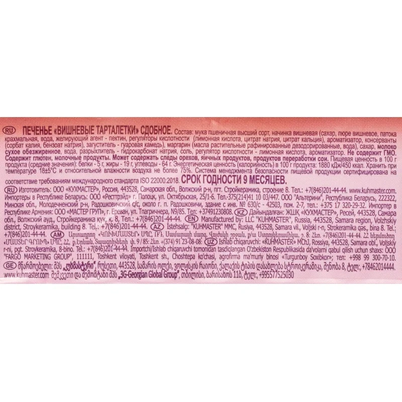 Состав: мука пшеничная высший сорт, джем вишневый (сахар, пюре вишневое, патока крахмальная, влагоудерживающий агент (глицерин), желирующий агент (пектин), регулятор кислотности (цитрат натрия, лимонная кислота, цитрат кальция), консерванты (сорбат калия, бензоат натрия), ароматизатор (вишня)), маргарин (рафинированные дезодорированные растительные масла в натуральном и модифицированном виде, в том числе соевое, эмульгатор (моно- и диглицериды жирных кислот)соль, консервант (сорбат калия), регулятор кислотности (лимонная кислота), краситель (бета -каротин), антиокислитель (концентрат смеси токоферолов)), сахар, вода, молоко обезжиренное сухое, разрыхлитель (сода пищевая), ароматизатор (ваниль). Содержит глютен, молочные продукты. Может содержать следы орехов, яичного белка.
