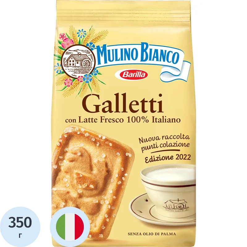 Сахарное печенье Mulino Bianco Galletti приготовлено на основе домашнего итальянского рецепта. Сладкий вкус, насыщенный аромат и посыпка из сахарных кристаллов никого не оставят равнодушным! Натуральное хрустящее итальянское печенье идеально подойдёт для завтрака или лёгкого перекуса, станет отличным дополнением к чашке чая, какао или кофе. Печенье не содержит красителей, усилителей вкуса и других искусственных добавок. Его также можно использовать при приготовлении различных десертов, тортов или других кулинарных изысков