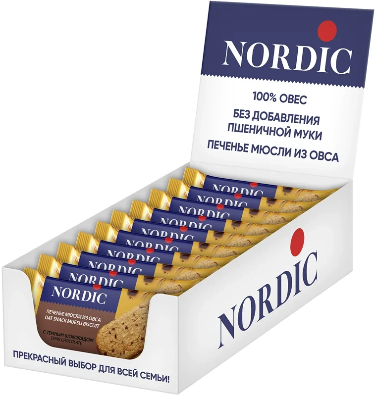 Печенье мюсли Nordic из овса это полезный, здоровый и вкусный перекус в любое время. Быстрый источник здоровой энергии! Подходит и взрослым и детям. Удобно брать с собой. Печенье мюсли из овса произведены по оригинальной финской рецептуре, в которой используются только высококачественные ингредиенты. Не очень сладкий продукт, не содержит молока и яиц. Удобная упаковка и все преимущества цельного зерна и овсяной каши в одной галете.