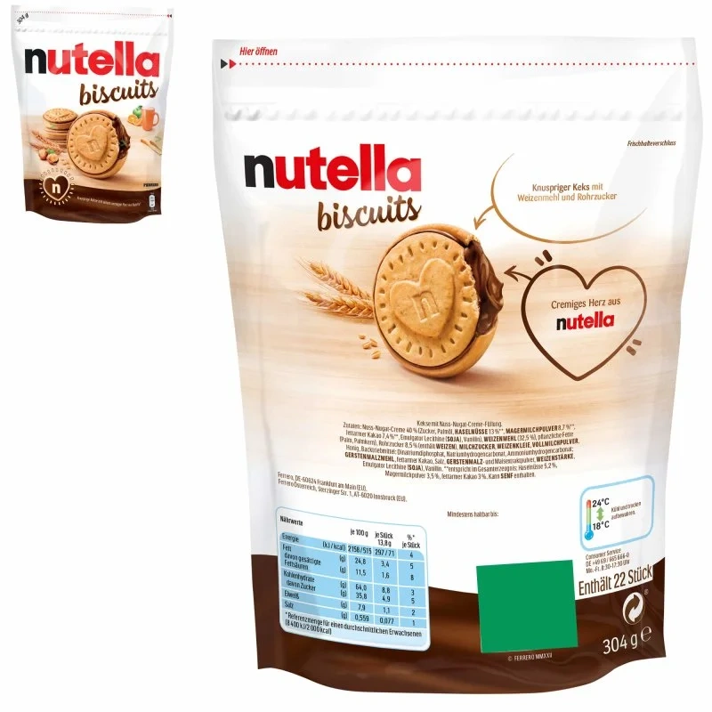 Восхитительный хрустящий бисквит из пшеничной муки, тростникового сахара и кремовой начинки Nutella. Превратите каждый перерыв в восхитительный опыт. Все, что вам нравится в хрустящем бисквите, со всей кремовой консистенцией и уникальным вкусом Nutella. Идеально для завтрака или перекуса в школе или на прогулке.