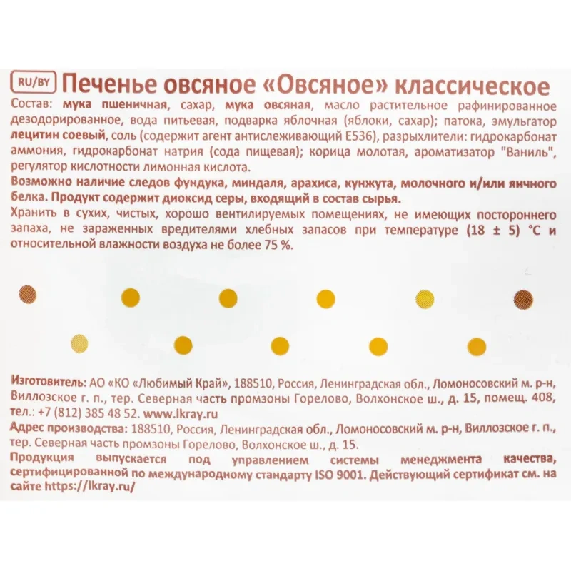 Состав: мука пшеничная, сахар, мука овсяная, масло растительное рафинированное дезодорированное, вода питьевая, полуфабрикат яблочный (пюре яблочное, сахар, загуститель: пектин, регулятор кислотности: лимонная кислота), патока, эмульгатор: лецитин соевый, соль, разрыхлители: гидрокарбонат аммония, гидрокарбонат натрия (сода пищевая), корица, ароматизатор, регулятор кислотности: лимонная кислота.
