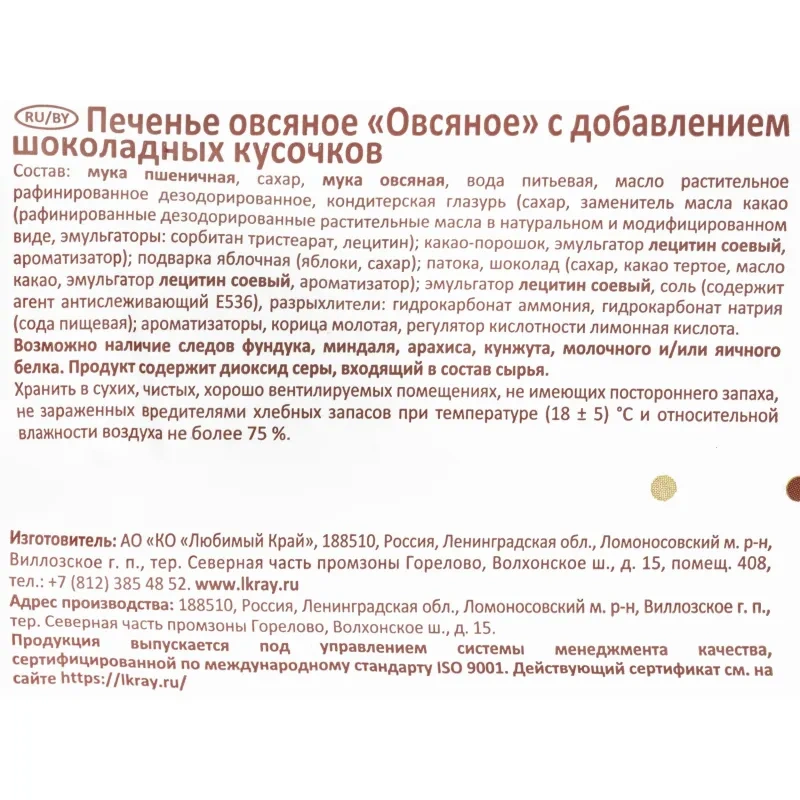 Состав: мука пшеничная, сахар, мука овсяная, вода питьевая, масло растительное рафинированное дезодорированное, кондитерская глазурь (сахар, заменитель масла какао (рафинированные дезодорированные растительные масла в натуральном и модифицированном виде, эмульгатор лецитин), какао-порошок, эмульгатор: лецитин соевый, ароматизатор), полуфабрикат яблочный (пюре яблочное, сахар, загуститель: пектин, регулятор кислотности: лимонная кислота), патока, шоколад (сахар, какао тёртое, масло какао, эмульгатор лецитин соевый, ароматизатор), эмульгатор: лецитин соевый, соль, разрыхлители: гидрокарбонат аммония, гидрокарбонат натрия (сода пищевая), корица, ароматизаторы, регулятор кислотности: лимонная кислота.