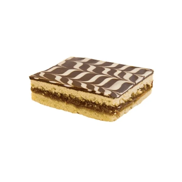 Двухслойное пирожное с прослойкой вареной сгущенки, покрытое шоколадной глазурью, укашенное белой глазурью.