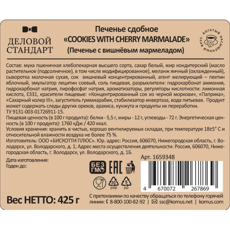 Печенье сдобное Деловой Стандарт Cookies with cherry marmalade, 425г
