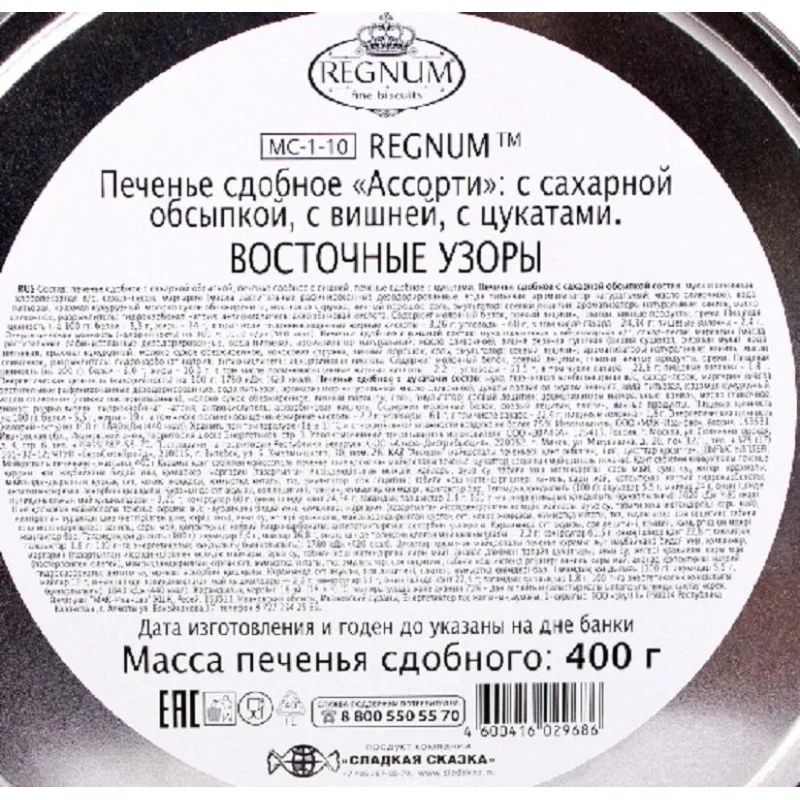 Печенье сдобное Regnum Восточные узоры с сах. обс., с виш., с цукат., 400г Печенье сдобное Regnum Восточные узоры ассорти 400 г. Состав: мука пшеничная хлебопекарная в/с, сахар-песок, маргарин (масла растительные рафинированные дезодорированные, вода питьевая, ароматизатор натуральный: масло сливочное), вода питьевая, крахмал кукурузный, молоко сухое обезжиренное, кокосовая стружка, яичный порошок, соль, эмульгатор: соевый лецитин, ароматизаторы натуральные: ваниль, масло сливочное, разрыхлитель: гидрокарбонат натрия, антиокислитель: аскорбиновая кислота. Содержит молочный белок, соевый лецитин, глютен, яичные продукты, орехи. Пищевая ценность (на 100 г): белки - 5,5 г, жиры - 24 г, в том числе полиненасыщенные жирные кислоты - 3,26 г, углеводы - 60 г, в том числе сахара 24,34 г, пищевые волокна 2,4 г. Энергетическая ценность (калорийность) на 100 г: 2020 кДж (480 ккал). Хранить при температуре (18+5)°С и относительной влажности воздуха не более 75%. Срок годности: 18 месяцев. Масса нетто: 400 г. Тип упаковки: жестяная банка. Страна производства: Россия. Товар поставляется в нескольких вариантах дизайна без возможности выбора.