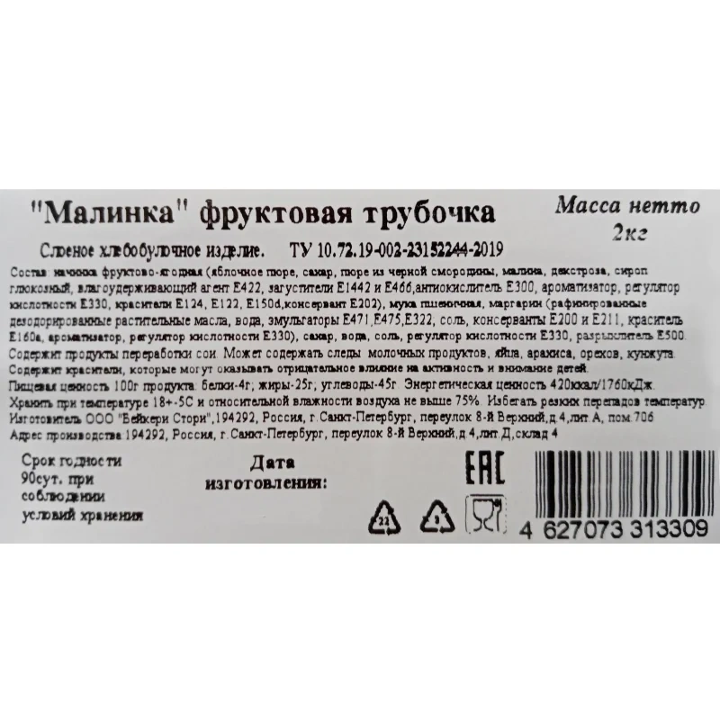 Состав: начинка фруктовая с ароматом малины (яблочное пюре, сахар, пюре из чёрной смородины, малина, антиокислитель аскорбиновая кислота, ароматизатор, регулятор кислотности лимонная кислота, краситель Е124, консервант сорбат калия), мука пшеничная хлебопекарная, маргарин (рафинированные дезодорированные растительные масла, вода, эмульгаторы: Е472с и Е475; соль, консерванты сорбиновая кислота и бензоат натрия, краситель каротин, ароматизатор, регулятор кислотности лимонная кислота), сахар, вода, соль пищевая, дрожжи хлебопекарные, регулятор кислотности лимонная кислота, подсолнечное масло, белок гороховый, декстроза, мальтодекстрины, крахмал кукурузный. Может содержать следы молочных продуктов, яйца, арахиса, орехов, кунжута. Содержит краситель, который может оказывать отрицательное влияние на активность и внимание детей.