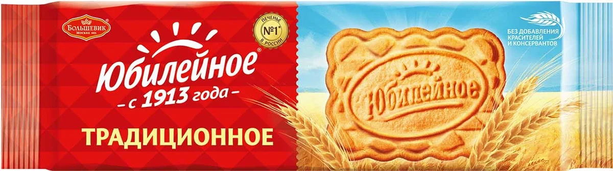Юбилейное Традиционное — печенье с приятным сливочным вкусом и нежной рассыпчатой текстурой. Юбилейное печенье считается настоящей классикой среди сладостей к чаю. Его оригинальный вкус уже более ста лет покоряет сердца любителей сладкого любого возраста. Для производства печенья используются только отборные ингредиенты — без добавления красителей и консервантов. Также печенье к чаю содержит витаминно-минеральный комплекс. Традиционный вкус, проверенная временем рецептура и польза — в этом секрет успеха сладкого к чаю от бренда Юбилейное. Вкусное печенье отлично подойдет к кофе и подарит хорошее настроение на весь день. Также компактную упаковку печенья 112 г можно взять с собой на работу или положить в школу детям. Печенье можно использовать для приготовления аппетитных домашних десертов: тирамису, пирожное картошка, чизкейк, дамские пальчики и торт муравейник. Печенье Юбилейное Традиционное сочетается с маслом, вареньем, медом. Найдите свой идеальный дуэт или ешьте печенье прямо из упаковки — неповторимый вкус Юбилейного прекрасно раскрывается без добавок!
