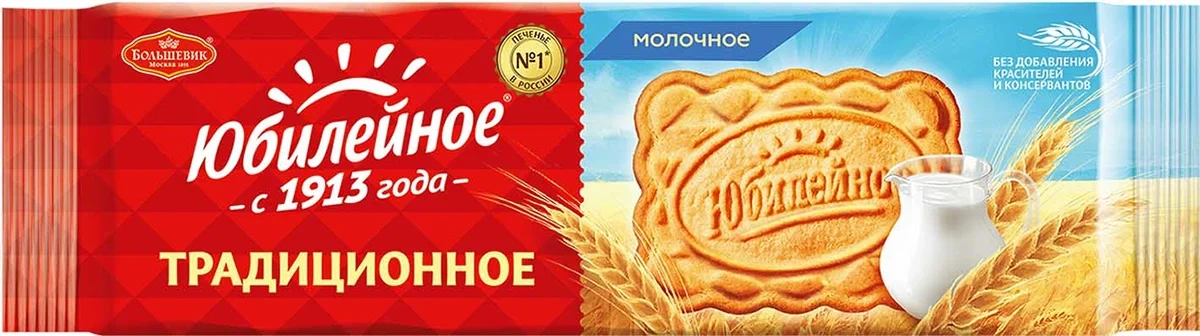 Юбилейное Традиционное Молочное — печенье с домашним ароматом и нежным молочным вкусом, которое буквально тает во рту. Юбилейное печенье станет идеальным перекусом для тех, кто любит побаловать себя сладким к чаю и хочет зарядиться хорошим настроением. Вкусное печенье Юбилейное радует любителей сладкого уже более ста лет. Секрет такой популярности кроется в уникальной, проверенной временем рецептуре. В состав печенья входит молоко, мука и другие бережно отобранные ингредиенты — без красителей и консервантов! Печенье Юбилейное Молочное станет отличным вариантом для быстрого и вкусного завтрака. Достаньте печенье, заварите чашку бодрящего кофе и настройтесь на продуктивный день. Печенье к кофе отлично подойдет и для перекуса — берите компактную упаковку 112 г с собой на работу, в дорогу или положите в школу детям. Печенье можно использовать для приготовления аппетитных домашних десертов: тирамису, пирожное картошка, чизкейк, дамские пальчики и торт муравейник. Печенье Юбилейное прекрасно сочетается с маслом, вареньем или медом. Также печенье к чаю можно есть без добавок — оно обладает сбалансированным оригинальным вкусом.