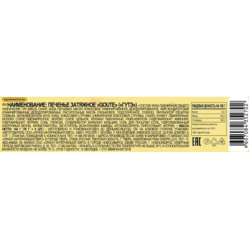 Состав: мука пшеничная общего назначения тип м55-23, сахар, вода питьевая, масло кокосовое рафинированное дезодорированное, жир кондитерский соевый (рафинированные дезодорированные растительные масла (пальмовое, подсолнечное, соевое), эмульгатор (лецитин соевый), антиокислители (E319, E330)), кокосовая стружка (обжаренная кокосовая стружка, сахар), кунжут обжаренный, молоко сухое обезжиренное, молоко сухое цельное, крахмал пшеничный, разрыхлители (гидрокарбонат аммония, гидрокарбонат натрия), соль, глюкоза, стабилизатор (карбонат кальция), соль для посыпки (соль гидролизованный кукурузный белок), ароматизаторы, загуститель (ксантановая камёдь), антиокислитель (пиросульфит натрия).