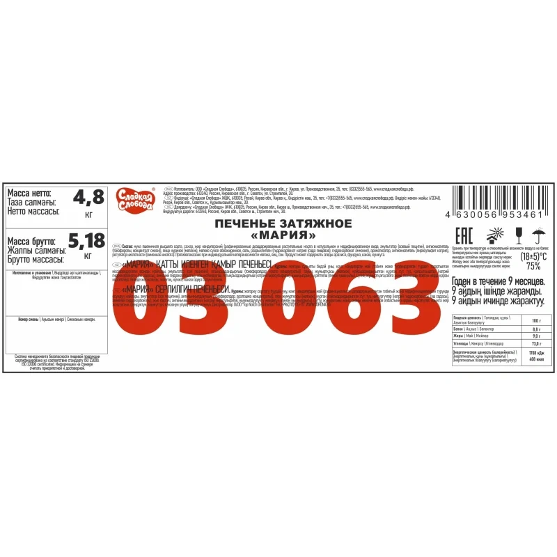 Печенье затяжное 'Сладкая слобода Мария' весом 4,8 кг - классическое затяжное печенье, знакомое с детства. Оно отличается воздушной текстурой и хрустящей корочкой. В составе содержится меньше сахара и жиров по сравнению с сахарным и сдобным печеньем.