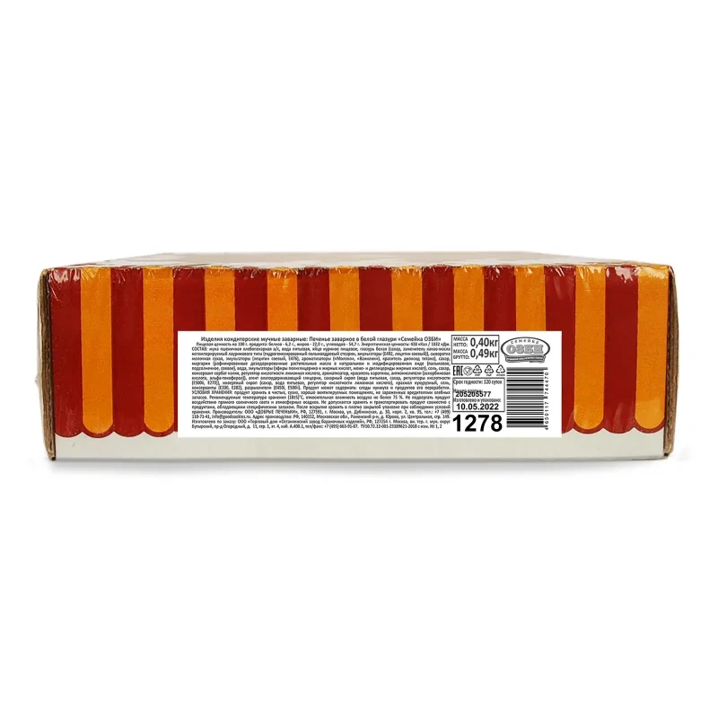 Пищевая ценность на 100 г: белки — 6,2 г, жиры — 22,0 г, углеводы — 54,7 г. Энергетическая ценность: 1832 кДж (438 ккал). ТУ10.72.12-001-23389621-2018 с изм. № 1, 2. Вес: 400 г.