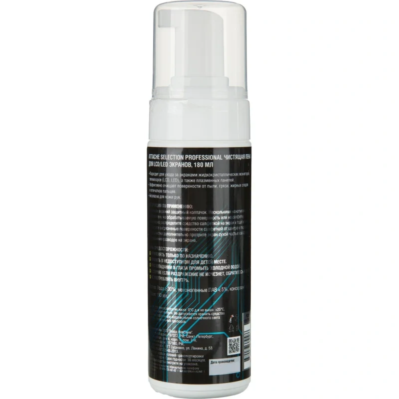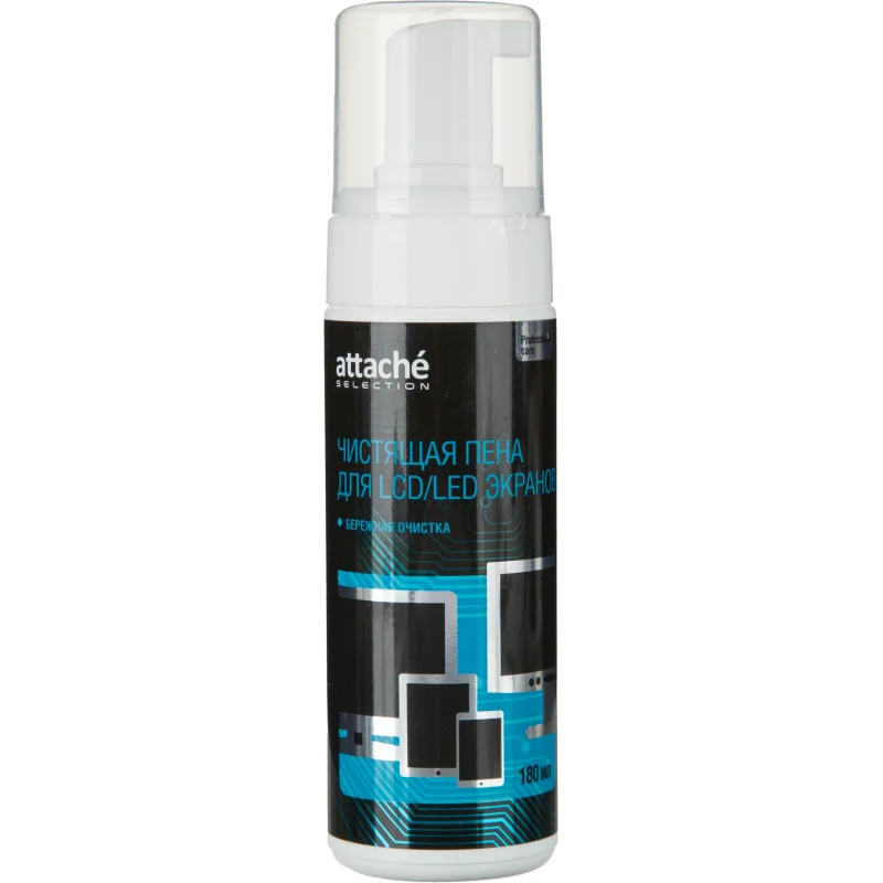 Пена чистящая для LCD/LED экранов Attache Selection Professional, 180 мл Чистящая пена предназначена для очистки и ухода за экранами мониторов, ноутбуков, планшетов и смартфонов. Очищает поверхность экрана от пыли, грязи и отпечатков пальцев. Пена образуется за счет обильного притока воздуха, что позволяет чистящему составу активней расщеплять загрязнения на поверхности. При очистки рекомендуется использовать салфетку из микроволокна, что позволяет идеально очистить экран от загрязнений без образования разводов. Объем 180 мл.