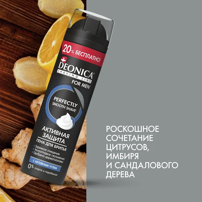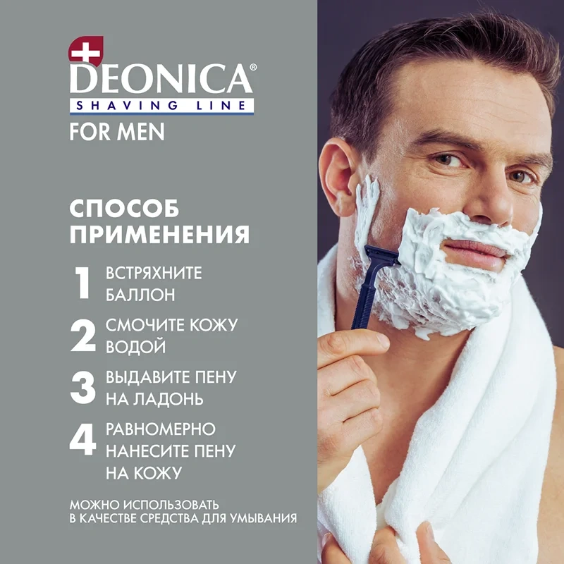 Пена для бритья Deonica for men Активная защита с черным углем обеспечивает ультрагладкое скольжение и очищение кожи. Черный бамбуковый уголь в составе оказывает антибактериальное действие, защищает от раздражений и способствует заживлению мелких повреждений, таких как царапины и порезы. Продукт не содержит парабенов и этилового спирта, что делает его безопасным и бережным. Мягкая формула подходит для мужчин и для чувствительной кожи подростков с 14 лет. Мужская пенка Deonica не растекается, хорошо держит форму и равномерно распределяется, что обеспечивает легкое нанесение и экономичный расход. Средство эффективно справляется с любой густотой щетины или бороды, гарантируя гладкое и качественное бритье без раздражений и покраснений. Успокаивающая пена совместима с любыми типами бритв и станков, улучшая их скольжение и снижая риск порезов. Регулярное использование делает кожу более гладкой и процесс бритья – максимально комфортным. Кроме того, пену можно использовать не только для лица, но и для удаления волос на теле.