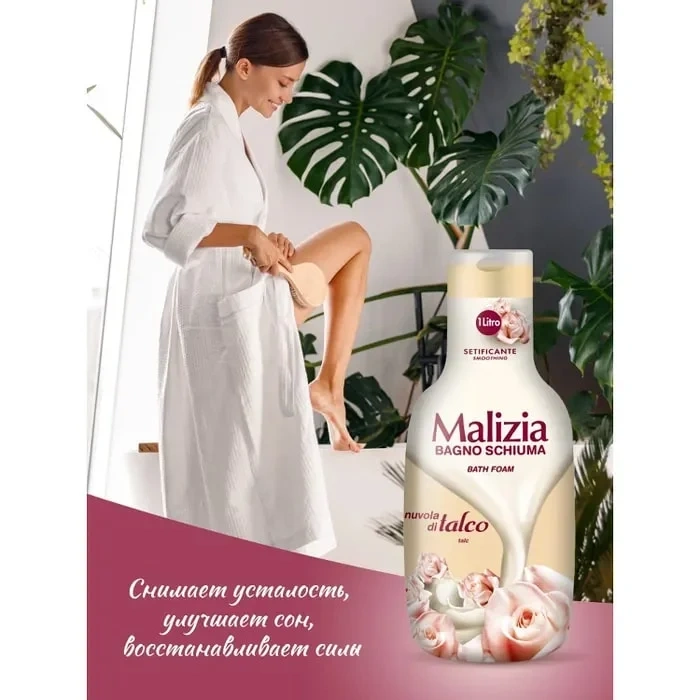 Пена для ванны и гель для душа без парабенов и красителей с тальком от итальянского бренда Malizia - это легкое удовольствие, которое вы можете позволить себе прямо в своей ванне. Благодаря своей формуле, она увлажняет, смягчает кожу, а также содержит натуральные экстракты. Идеально борется с сухостью кожи. Аромат талька поможет вам расслабиться, а дополнительные свойства хлопка успокоят вашу кожу. Ароматная пена деликатно очищает кожу и дарит небывалое ощущение мягкости и нежности, без пересушивания, наполняя ванну миллионами нежных пузырьков. Аромат полностью раскрывается на коже. Подходит как женщинам, так и мужчинам. Соответствует естественному уровню pH кожи. Проверен дерматологами. Не тестируется на животных.
