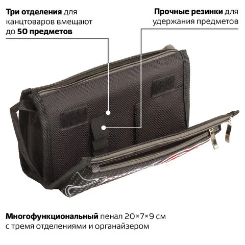 Выполнен из прочного полиэстера, декорирован резиновой нашивкой. Внутри пенала подкладка из полиэстера. Имеет три отделения и органайзер для канцелярских принадлежностей. Застегивается на молнию с металлическим бегунком. Поставляется в прозрачном полиэтиленовом пакете с картонным подвесом.