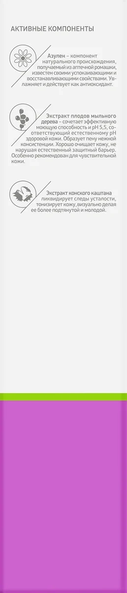 Пышная, как взбитые сливки, пенка для умывания мягко и эффективно удаляет макияж и естественные загрязнения, не оставляет неприятного чувства стянутости. Растворяет излишки себума, устраняет черные точки, выравнивает тон, возвращает природную яркость и свежесть. Сочетание компонентов в составе пенки обеспечивает успокаивающее и смягчающее воздействие и прекрасную переносимость кожей. Азулен помогает удерживать влагу, способствует регенерации и восстановлению здорового уровня PH. Экстракт плодов мыльного дерева – действенный мягкий очищающий ингредиент естественного происхождения, рекомендованный для чувствительной кожи. Экстракт конского каштана ликвидирует следы усталости, тонизирует кожу, визуально делая ее более п??дтянутой и молодой. Подходит для всех типов кожи, в том числе чувствительной и проблемной. Применение: небольшое количество средства вспенить между ладонями, нанести образовавшуюся пену на влажное лицо. Распределить массажными движениями, избавляя кожу от загрязнений. Тщательно смыть теплой водой.