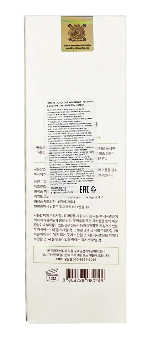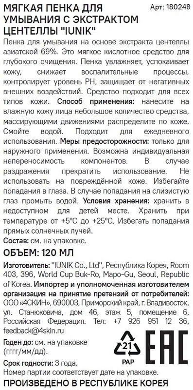 Пенка для умывания Iunik мягкая с экстрактом центеллы, 120мл