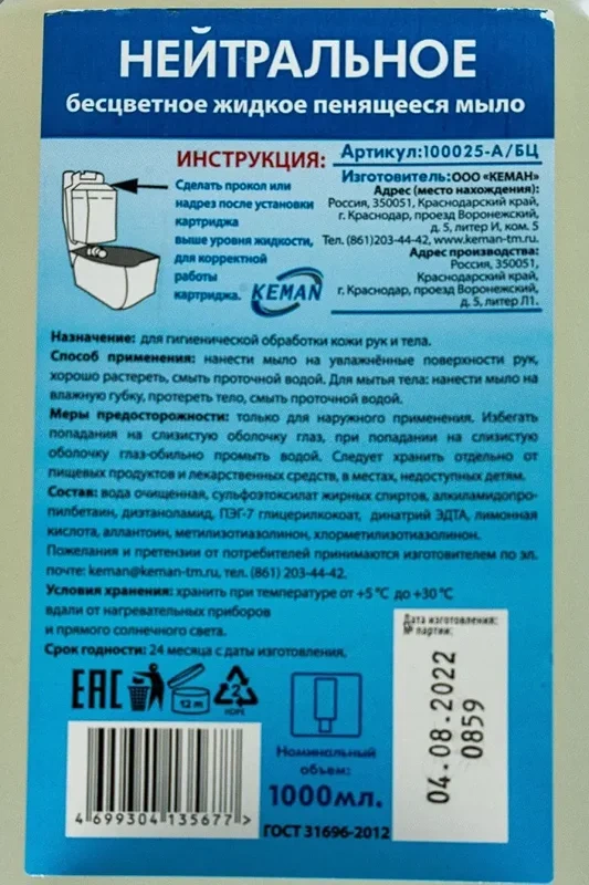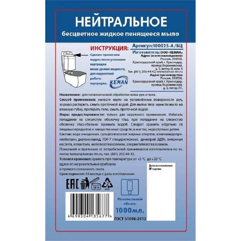 КEMAN Нейтральное жидкое пенящееся мыло в картридже для диспенсеров Kimberly Clark Aquarius.Нейтральное жидкое мыло-пена КЕМАN 100025-БЦ1000 для мытья рук и тела без красителей и отдушки. Дерматологически мягкая основа. Аллантоин в составе оказывает смягчающее и увлажняющее действие.Картридж 1000 мл на 2 500 порцийМыло предназначено для диспенсеров с пенным дозированием. Не оставляет подтёков и следов на раковине. Картридж герметично запечатан и снабжён одноразовым дозирующим устройством. Это предотвращает риск перекрёстного загрязнения и препятствует попаданию патогенной микрофлоры внутрь картриджа.Область применения: в медицинских учреждениях (больницах, госпиталях, медицинских пунктах, лабораториях, поликлиниках, медицинских центрах); в оздоровительных и профилактических учреждениях (санаториях, детских лагерях, профилакториях); в детских учреждениях (ясли, детские сады, дома ребенка, школы, подростковых центрах творчества); в образовательных заведениях (колледжах, училищах, университетах); в сфере соцобеспечения (хосписы, дома престарелых, дома ветеранов); населением в быту; на предприятиях общественного питания (рестораны, кафе, бары, столовые); в пищевой и перерабатывающей промышленности (кондитерской, хлебопекарной, молочной, мясо-рыбоперерабатывающей, птицефабриках и т.д.); в гостиницах; в зонах питания гастрономов, супермаркетов, гипермаркетов, продуктовых магазинов, торговых центров и т.д