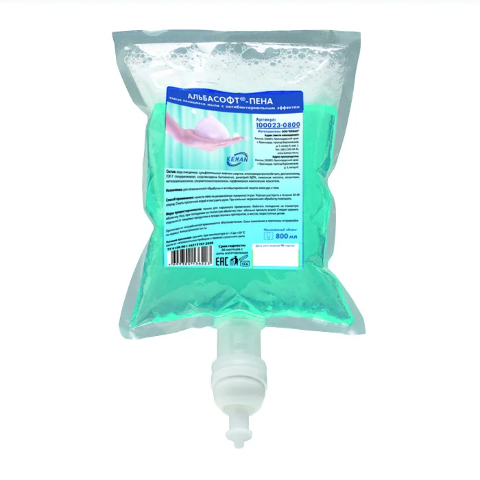 Мыло-пена Альбасофт-пена антибактериальное – картридж 800 мл (S34) KEMAN 100023-K800. Нейтральное жидкое мыло-пена с антибактериальным эффектом предназначено для гигиенической обработки кожи рук и тела. В состав входят защищающие ингредиенты, обеспечивающие многократное использование мыла в течение дня.