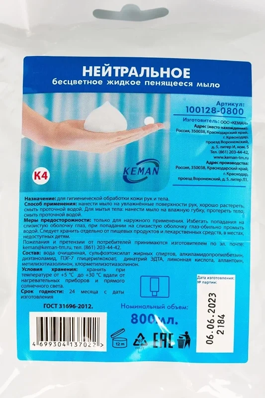 Пенное мыло в картридже Keman К4 800мл, бесцветное, 100128-0800