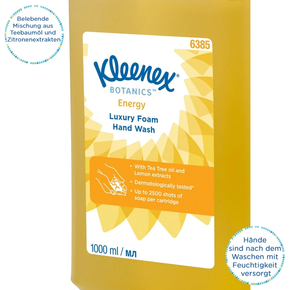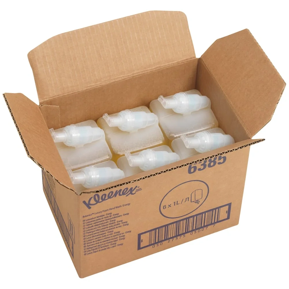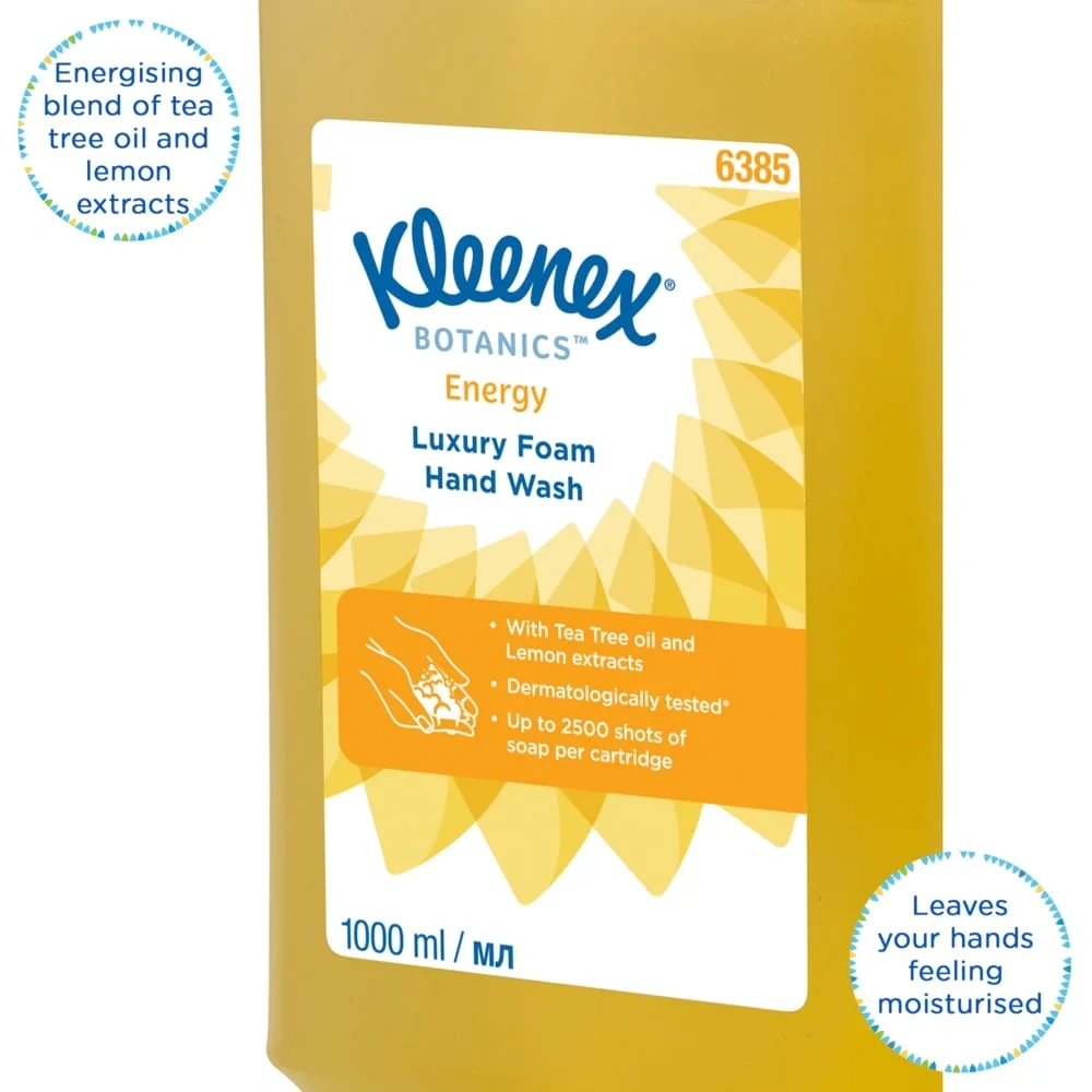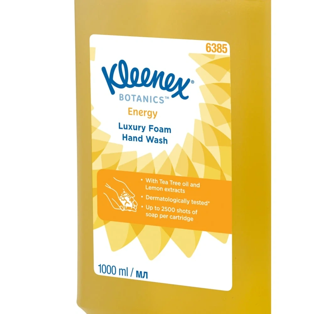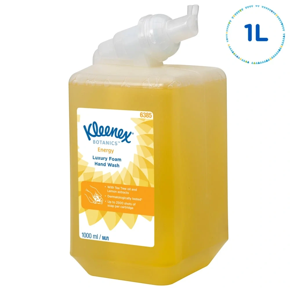 Окружите посетителей туалетных комнат заботой с помощью надежных и привычных решений Kleenex®, разработанных для непревзойденного качества обслуживания и поддержания высоких стандартов гигиены на рабочем месте. Продуманный ассортимент роскошных пенных моющих средств для рук с приятным ярким ароматом, которые гарантируют неизменное качество и заботу Kleenex®. В линейку Kleenex® Botanics™ входят наши самые роскошные средства очистки и мытья рук, обогащенные растительными экстрактами, маслом чайного дерева и экстрактом лимона, которые отлично поддерживают высокие стандарты гигиены и комфорта. Они порадуют посетителей туалетных комнат бодрящим, поднимающим настроение ароматом. Гипоаллергенное пенное мыло Kleenex® в сменных блоках разработано для частого мытья рук и безопасно для чувствительной кожи, что позволяет соблюдать высокий уровень гигиены на рабочем месте. Моющее средство для рук Kleenex® обогащено увлажняющими компонентами, благодаря которым средство не оставляет ощущения сухости. Сменные блоки с очищающим средством оснащены уникальной системой дозирующей помпы с двойной сеткой, которая при каждом нажатии создает роскошную мыльную пену. Каждый сменный блок обеспечивает в два раза более экономное использование, в сравнении с обычным жидким мылом. Один картридж содержит 2500 порций пенного моющего средства. Пенное мыло для рук Kleenex® Botanics™ Energy Luxury обладает приятным освежающим ароматом и прекрасно сочетается с освежителем воздуха Kleenex® Botanics™ Energy. Сменные блоки совместимы с разными моделями диспенсеров и подходят для любых туалетных комнат: дозаторы жидкого мыла для рук Aquarius™ белого цвета (код 6948), черного цвета (код 7173) и из нержавеющей стали (код 8973). Сменные блоки с пенным средством для мытья рук Kimberly-Clark™ разработаны для быстрой и простой установки, а замена картриджа займет менее 6 секунд. Использованный картридж может быть спрессован для экономии пространства и переработан после извлечения дозирующей помпы. Пенные моющие средства Kleenex® Botanics™ также доступны с ароматами Fresh и Joy (коды 6386 и 6387).