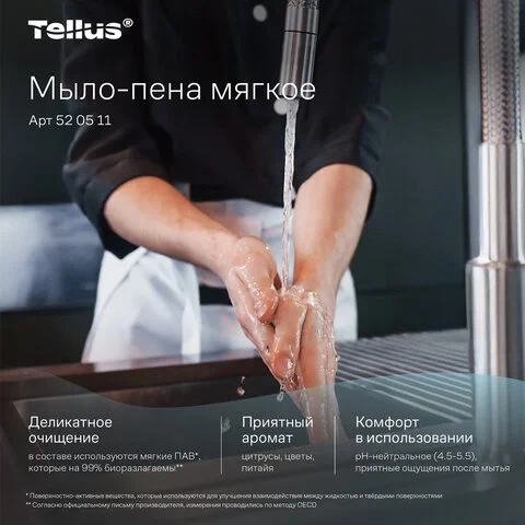 Назначение: Предложите посетителям мыло-пену со свежим ароматом, которое подходит для разных типов кожи. Tellus (Торк/Tork) жидкое мыло мягкое содержит ряд экстрактов, которые стимулируют обновление и восстановление кожи, способствуют ее питанию, увлажнению и смягчению. Специальный картридж образует мягкую кремовую пену для бережного мытья рук. Для использования в диспенсерах для мыла-пены Tellus (Торк/Tork). ПАВ, используемые в составе продукта, оказывают бережное очищающее действие во время мытья рук. Обладает легким свежим ароматом, pH — нейтральное мыло-пена. Продукт на 99% состоит из биоразлагаемых компонентов. Подтвержденные простота обслуживания и интуитивно понятная процедура перезаправки менее чем за 10 секунд. Гигиеничность: герметичный картридж снижает риск перекрестного заражения. Картридж подлежит переработке и сжимается в процессе использования, что позволяет уменьшить объем отходов. Уменьшение расхода до 50%; без ущерба для эффективности очищения рук; По данным внутреннего исследования Essity.