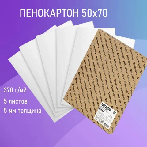 Пенокартон матовый, 50х70 см, толщина 5 мм, белый, КОМПЛЕКТ 5 листов, BRAUBERG, 112471